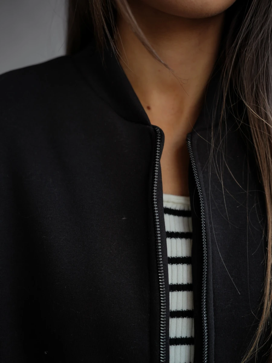Kurtka typu bomber, wykonana z gładkiej, nierozciągliwej tkaniny z miękkim ociepleniem wewnątrz. Klasyczny fason zapinany na suwak, ze ściągaczami przy rękawach i na dole, dzięki czemu model świetnie układa się na sylwetce. Dekolt wykończony prostą, zaokrągloną linią bez kołnierza dodaje minimalistycznego charakteru. Kurtka o standardowej długości, idealna do codziennych, nowoczesnych stylizacji.