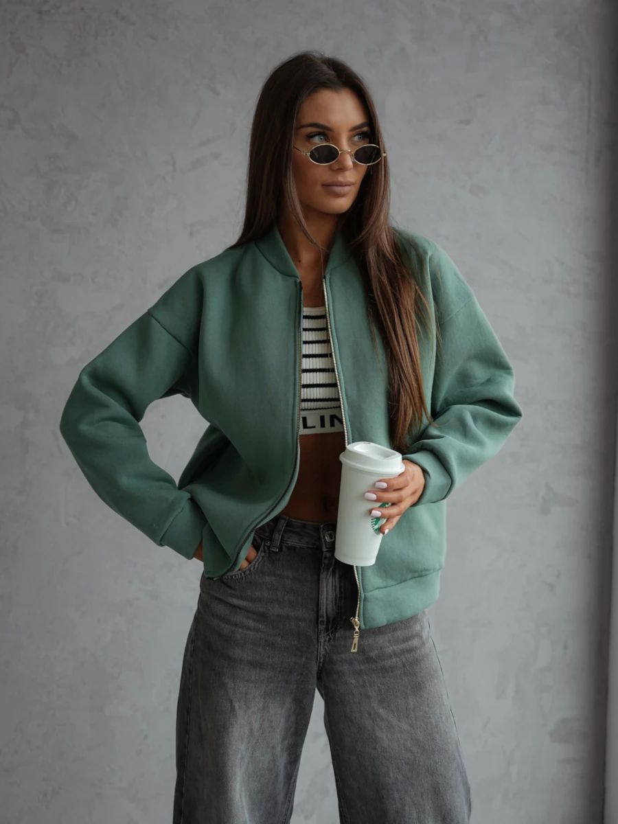 Kurtka typu bomber, wykonana z gładkiej, nierozciągliwej tkaniny z ociepleniem wewnątrz. Model zapinany na suwak na całej długości przodu. Rękawy długie, zakończone elastycznym ściągaczem. Dolna krawędź kurtki również wykończona ściągaczem, który stabilizuje fason i nadaje mu typowy, lekko bomberkowy kształt. Kurtka posiada klasyczny, zaokrąglony dekolt bez kołnierza. Model bez kaptura, o standardowej długości, idealny do codziennych stylizacji przez cały sezon.
