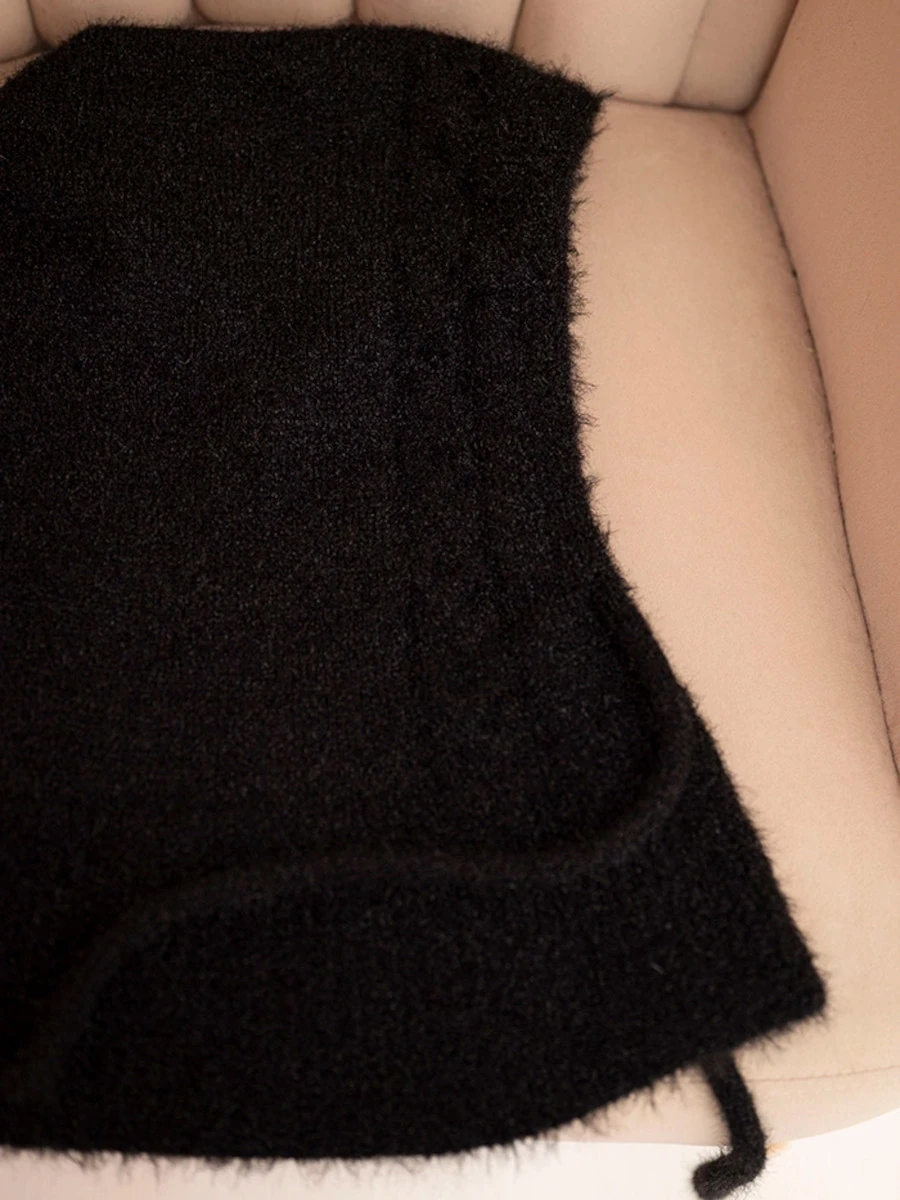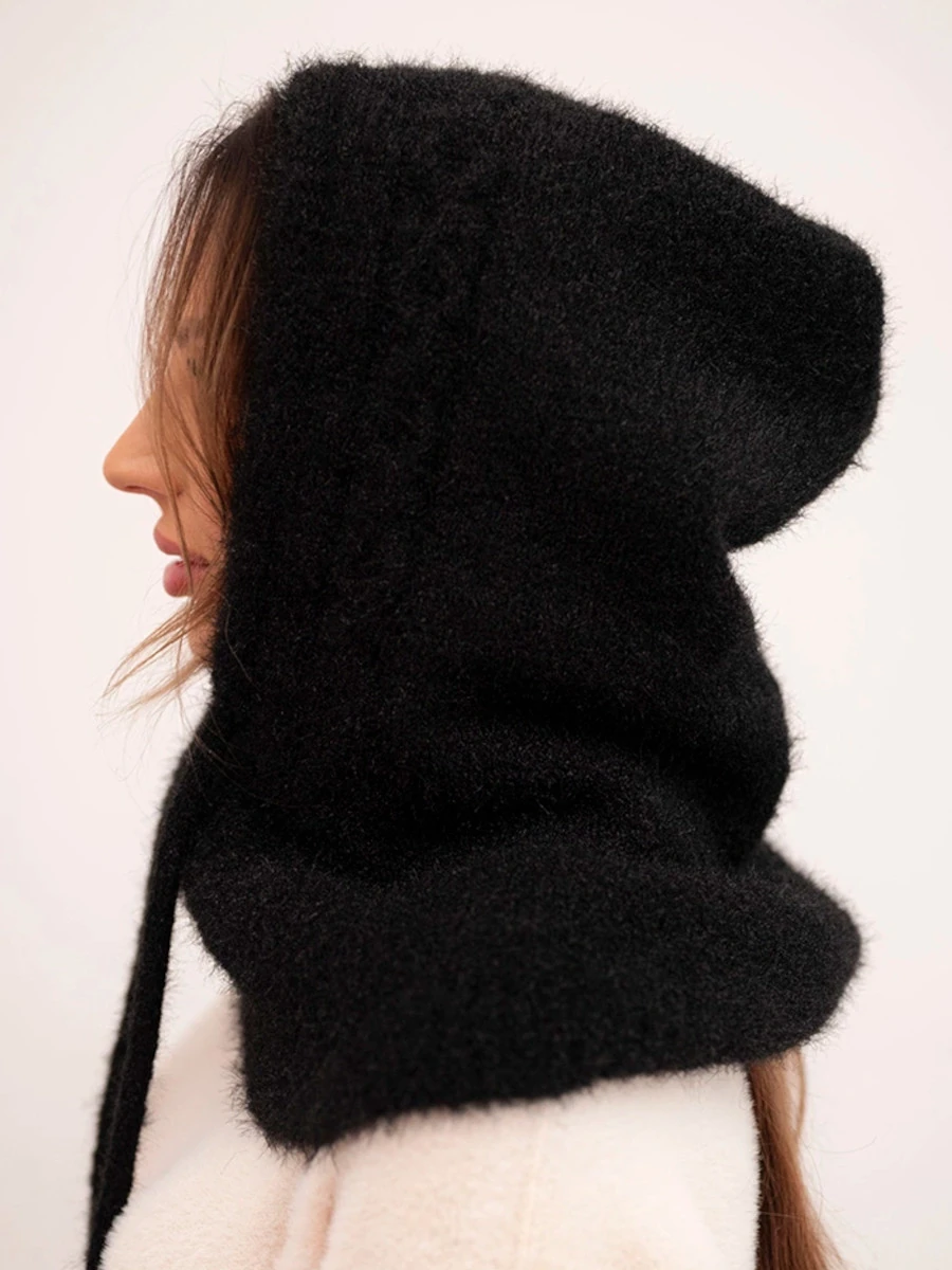 Czapka kaptur damski z wiązaniem i warkoczowym splotem – czarna