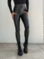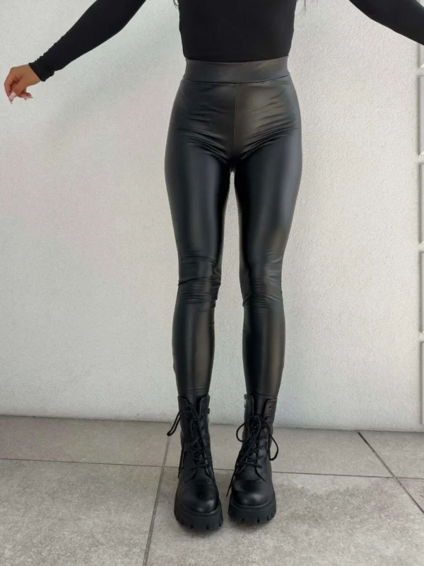Czarne legginsy damskie, wykonane z elastycznego materiału imitującego skórę, zaprojektowane z myślą o wygodzie i dopasowaniu do sylwetki. Model łączy efektowny wygląd z funkcjonalnością, dzięki czemu sprawdzi się w codziennych i miejskich stylizacjach.