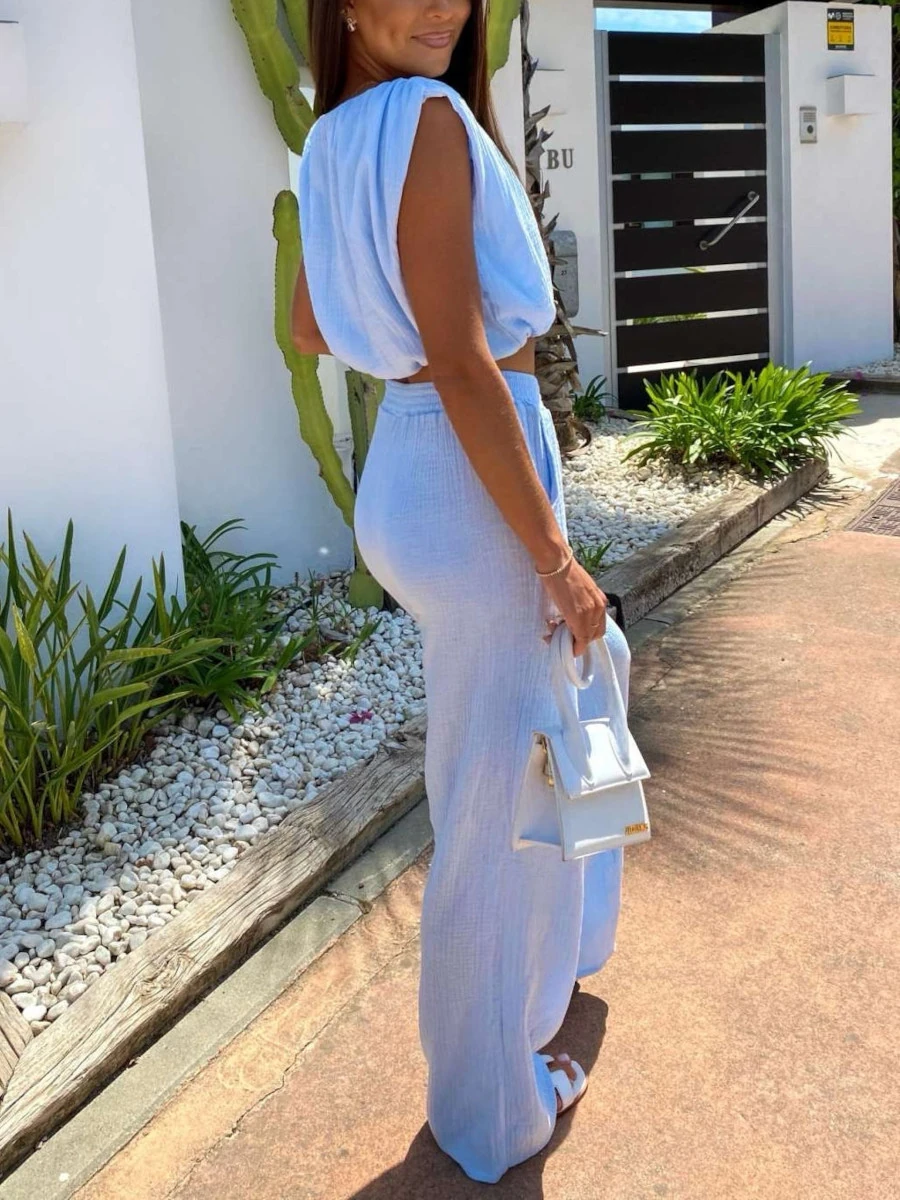 Lekki, kobiecy komplet muślinowy w błękitnym odcieniu, który idealnie sprawdzi się w ciepłe dni. Zestaw składa się z krótkiego topu oraz szerokich spodni wykonanych z oddychającej, lekko elastycznej tkaniny muślinowej — niezwykle komfortowej i przyjemnej dla skóry.