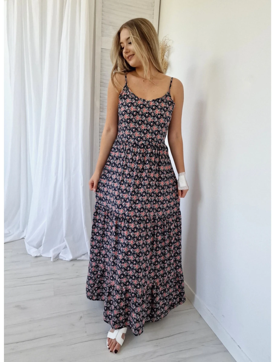 Sukienka maxi wykonana z lekkiej, przewiewnej tkaniny bawełnianej, ozdobiona drobnym kwiatowym wzorem. Model na cienkich, regulowanych ramiączkach, dzięki czemu łatwo dopasowuje się do sylwetki i zapewnia komfort noszenia. Fason delikatnie rozszerzany ku dołowi, tworzy zwiewną, kobiecą linię bez opinania bioder. Sukienka wkładana przez głowę — bez suwaka, bez podszewki, idealna na ciepłe dni.