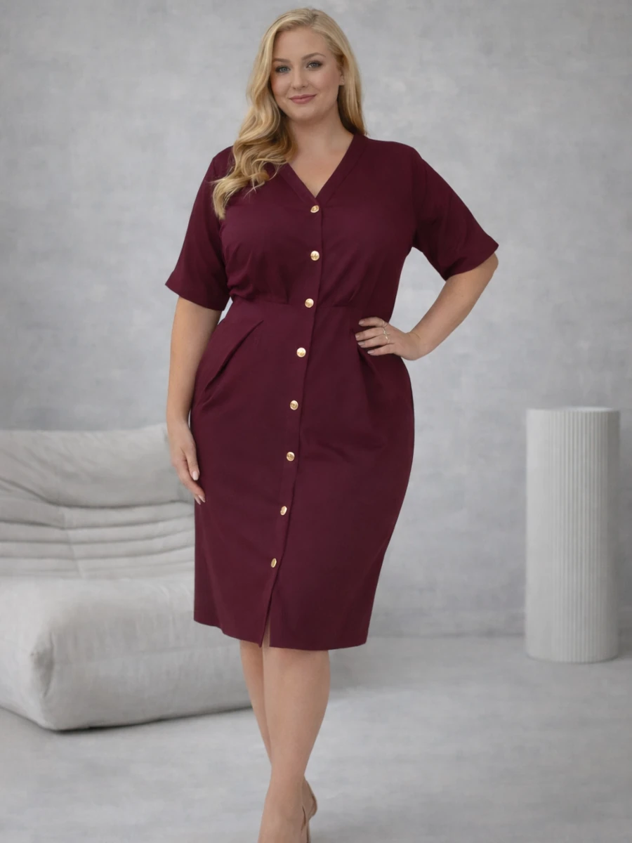 Góra sukienki została zaprojektowana z dekoltem w kształcie litery V, który subtelnie wysmukla szyję i podkreśla linię biustu. Na przodzie znajduje się rząd ozdobnych guzików, nadających całości elegancki, lekko biurowy charakter i optycznie wydłużających sylwetkę.