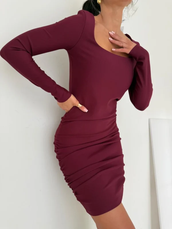 Zmysłowa, kobieca i maksymalnie modelująca sylwetkę – ta sukienka mini z długim rękawem została zaprojektowana tak, aby podkreślać to, co najważniejsze. Połączenie dopasowanego dołu, elastycznego materiału w prążek oraz marszczeń po bokach i z tyłu daje efekt pięknie wymodelowanej talii i wyraźnie zaakcentowanych pośladków.